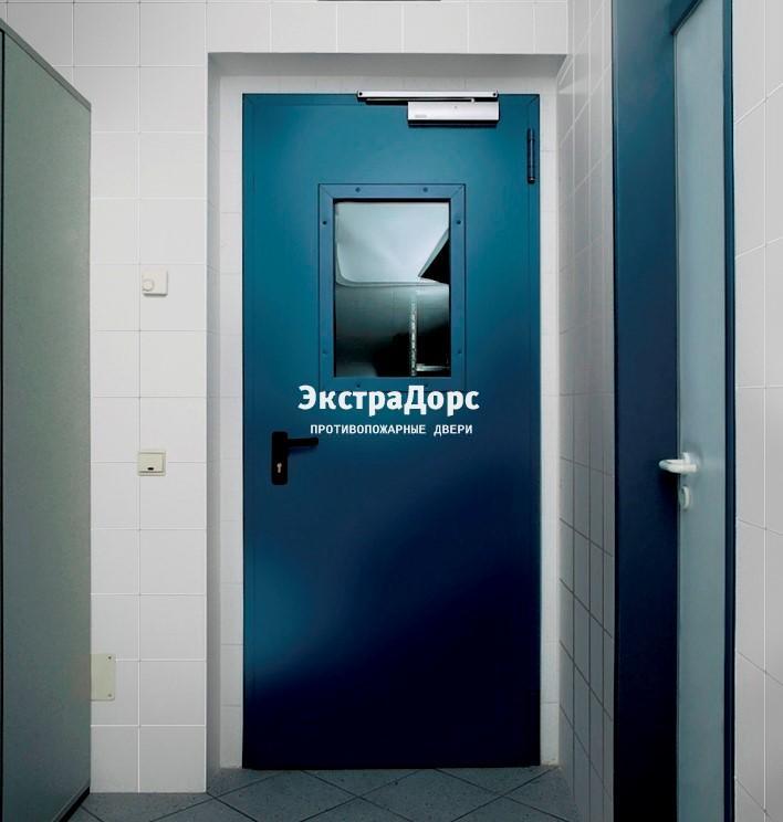 Противопожарная дверь 1 типа синяя c выпадающим порогом с остеклением в Видном